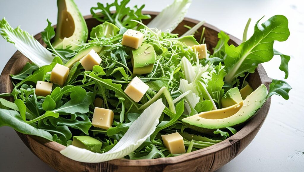 A salátát tálba tesszük, hozzádobjuk a felszeletelt avokádót és a feldarabolt sajtot, meglocsoljuk az öntettel, megszórjuk fűszerekkel.